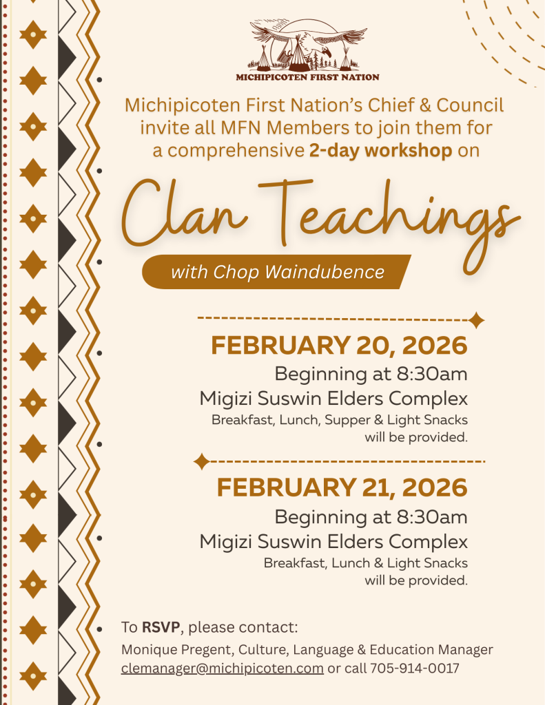 Michipicoten First Nation’s Chief & Council invite all MFN Members to join them for a comprehensive 2-day workshop on Clan Teachings with Chop Waindubence.
