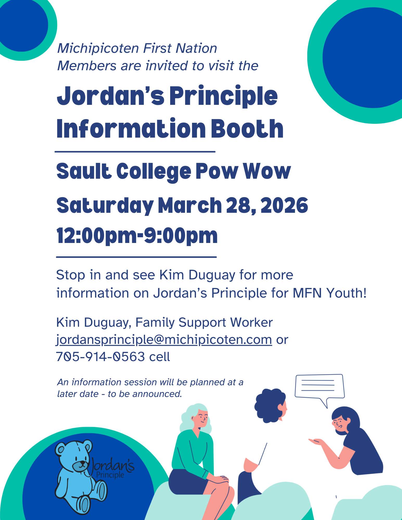 Michipicoten First Nation Members are invited to visit the Jordan’s Principle Information Booth at the Sault College Pow Wow on March 28, 2026 from 12:00pm-9:00pm. Stop in and see Kim Duguay for more information on Jordan’s Principle for MFN Youth! An information session will be planned at a later date – to be announced.