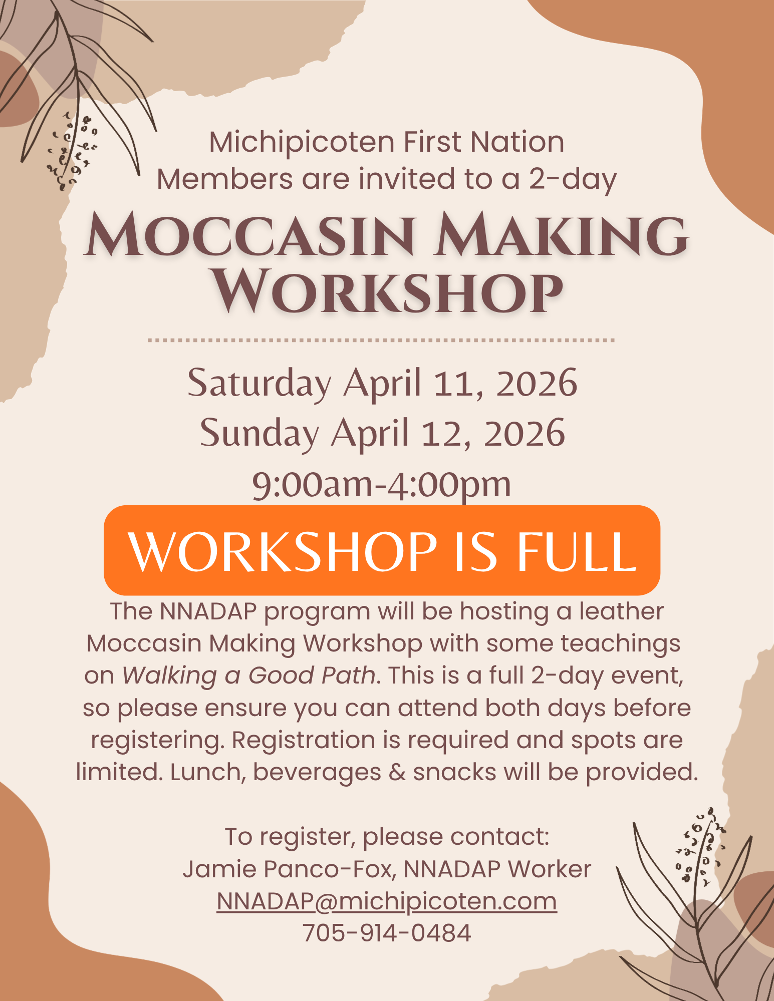 The NNADAP program will be hosting a leather Moccasin Making Workshop with some teachings on Walking a Good Path. This is a full 2-day event, so please ensure you can attend both days before registering. Registration is required and spots are limited – WORKSHOP IS NOW FULL. Lunch, beverages & snacks will be provided.