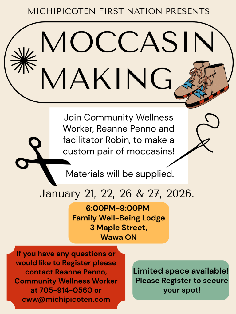 Limited spaces available! Please register to secure your spot. For any questions or to register, please contact Reanne Penno, Community Wellness Worker at cww@michipicoten.com or call 705-914-0560.