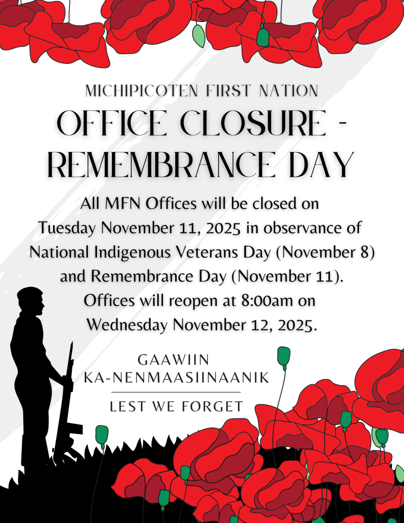 All MFN Offices will be closed on Tuesday November 11, 2025 in observance of National Indigenous Veterans Day (November 8) and Remembrance Day (November 11). Offices will reopen at 8:00am on Wednesday November 12, 2025. Gaawiin ka-nenmaasiinaanik – Lest we forget