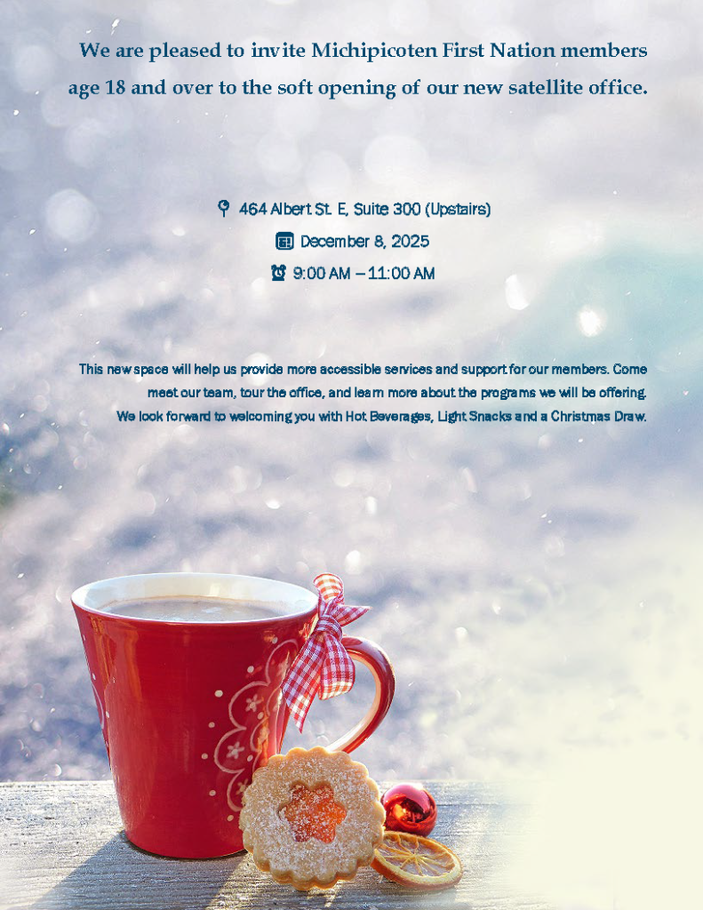 We are pleased to invite Michipicoten First Nation members (age 18 and over) to the soft opening of our new satellite office located at 464 Albert St E, Suite 300 (upstairs), Sault Ste Marie.