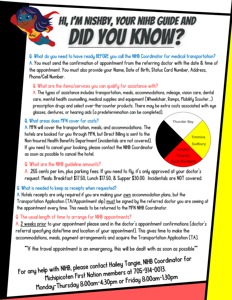 - NIHB Medical Travel – Contact Hailey Tangie at 705-914-0013 or email nihbcoordinator@michipicoten.com. After 4:15pm – call the NIHB Emergency number at 1-833-675-3081. Members who have submitted applications for travel to medical appointments through NIHB and need accommodations, the NIHB Coordinator will book the accommodations as required. In the event you are not able to attend your appointment or if your appointment is cancelled, we request that you cancel your hotel accommodations. If these accommodations are not cancelled, we are still required to pay for the room. Miigwetch for your assistance. **Please note over the Christmas Closure you must contact the NIHB Emergency Number 1-833-675-3081.