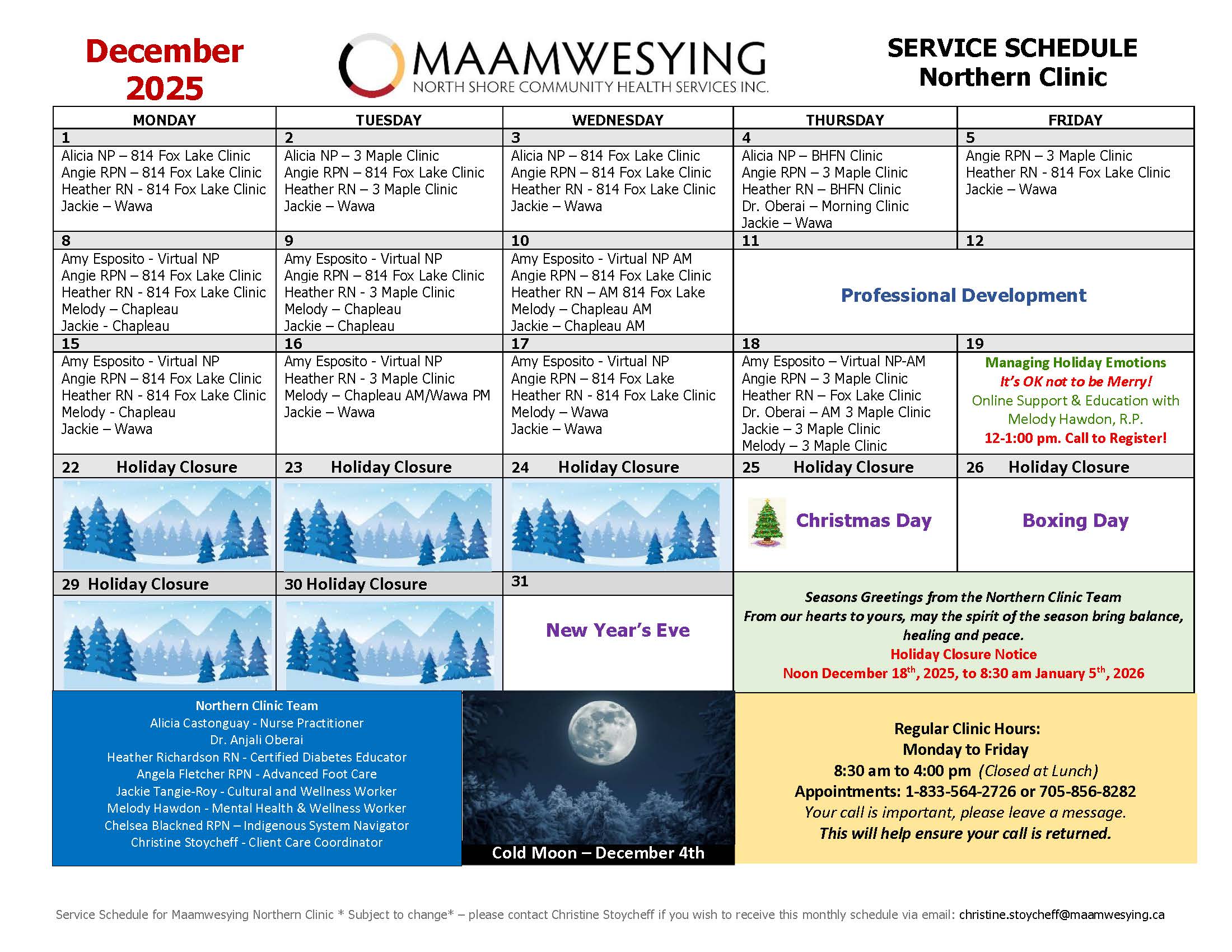 - Community Health Nurse Mary-Lou Kobzick (please call or text for an appointment 705-852-0243) will be at the MFN Health Centre on the following dates: